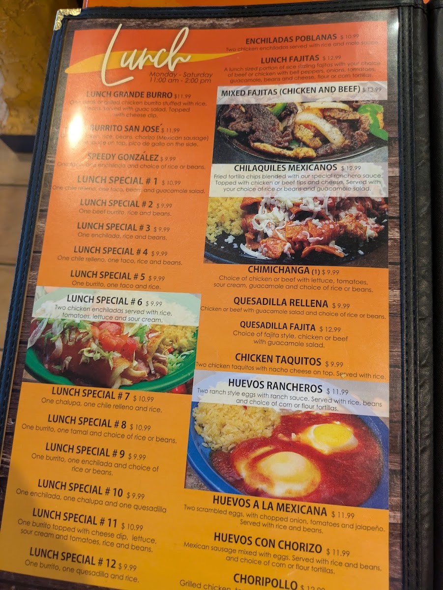 A lunch-sized portion of sizzling fajitas wit your choice of beef or chicken, with bell peppers, onions, tomatoes, guacamole, beans and rice, choice of tortillas.