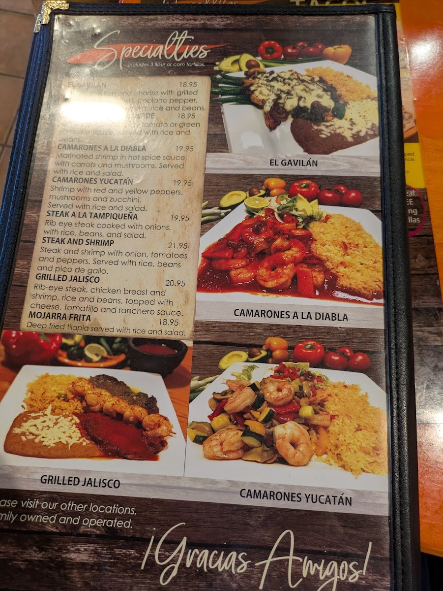Chicken, shrimp, steak, pineapple, mixed peppers, onions and tomatoes. Served with rice, beans, salad, lettuce, tomato, and guacamole.
