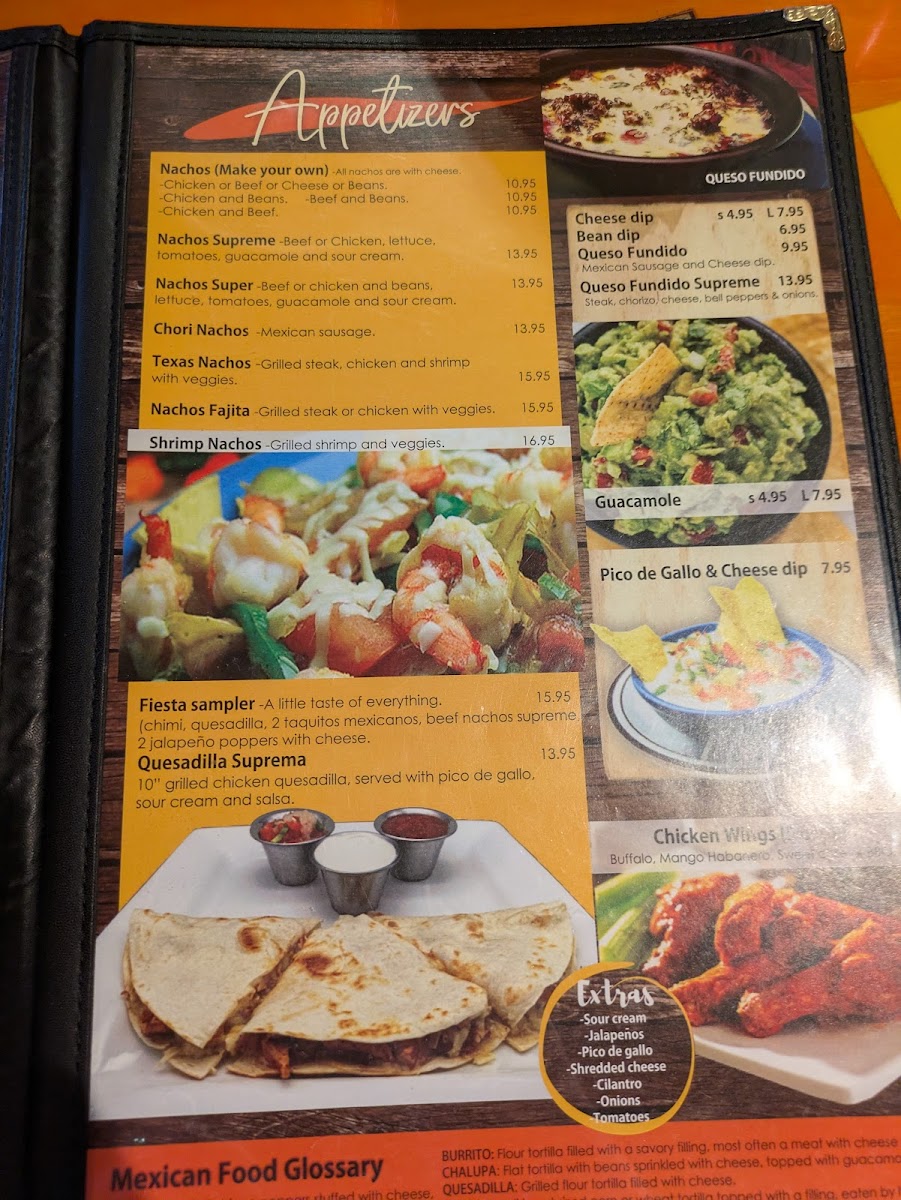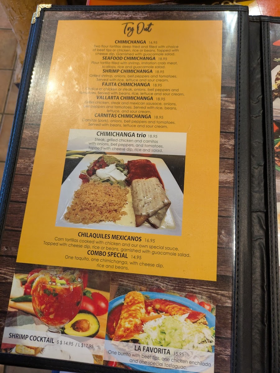 Two four tortillas deep fried and filled with choice of beef tips or chicken and fried beans. Topped with nacho cheese. Garnished with guacamole salad.