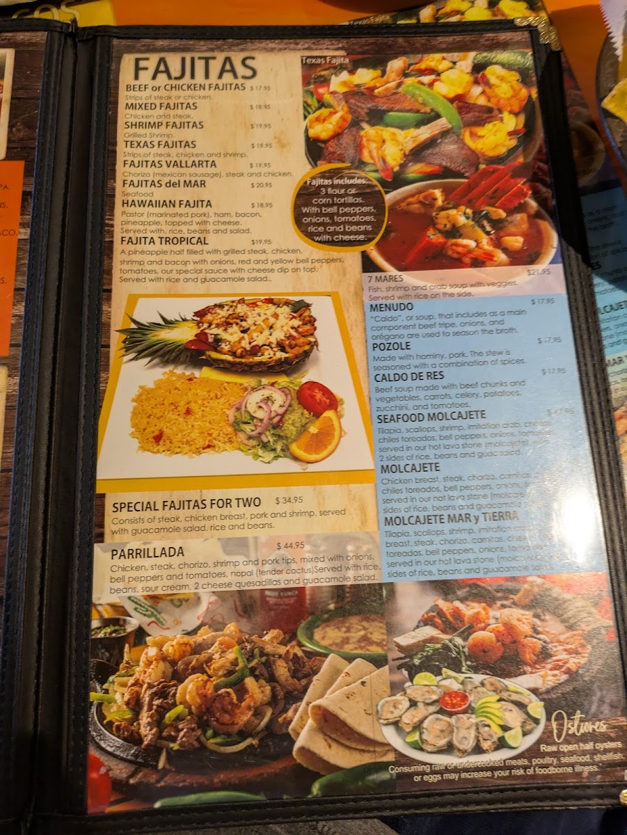 Choice of chicken or steak with bell peppers, onions served with guacamole, beans, cheese, tomatoes, and sour cream. add shrimp for additional cost.